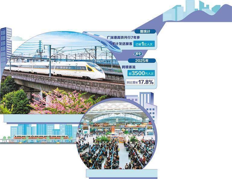 r据统计,广深港高铁开行7年多,累计发送旅客已破1亿人次,其中,2025年跨境客流超3500万人次,同比增长17.8%。