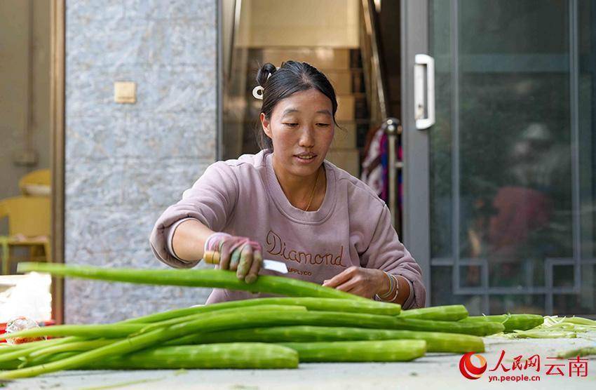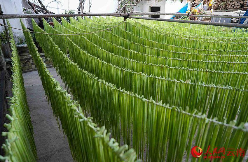 2月25日,云南省漾濞彝族自治县漾江镇桑不老村村民在给贡菜划条。人民网记者 虎遵会摄