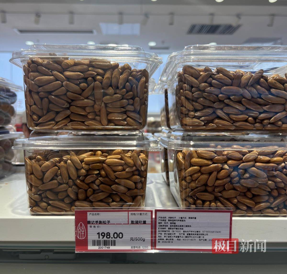 2月2日,极目新闻记者随机走访江西南昌一家薛记炒货线下门店,实地探访其价格情况。记者发现,门店内炒货价格分层明显:瓜子、花生等基础类现制炒货,单价为23.8元/斤左右;夏威夷果、开心果、碧根果等常见坚果类现制炒货,价格区间在60元/斤至100元/斤;而手剥松子、手剥山核桃仁两款高端炒货,价格尤为突出,分别高达198元/斤和218元/斤。